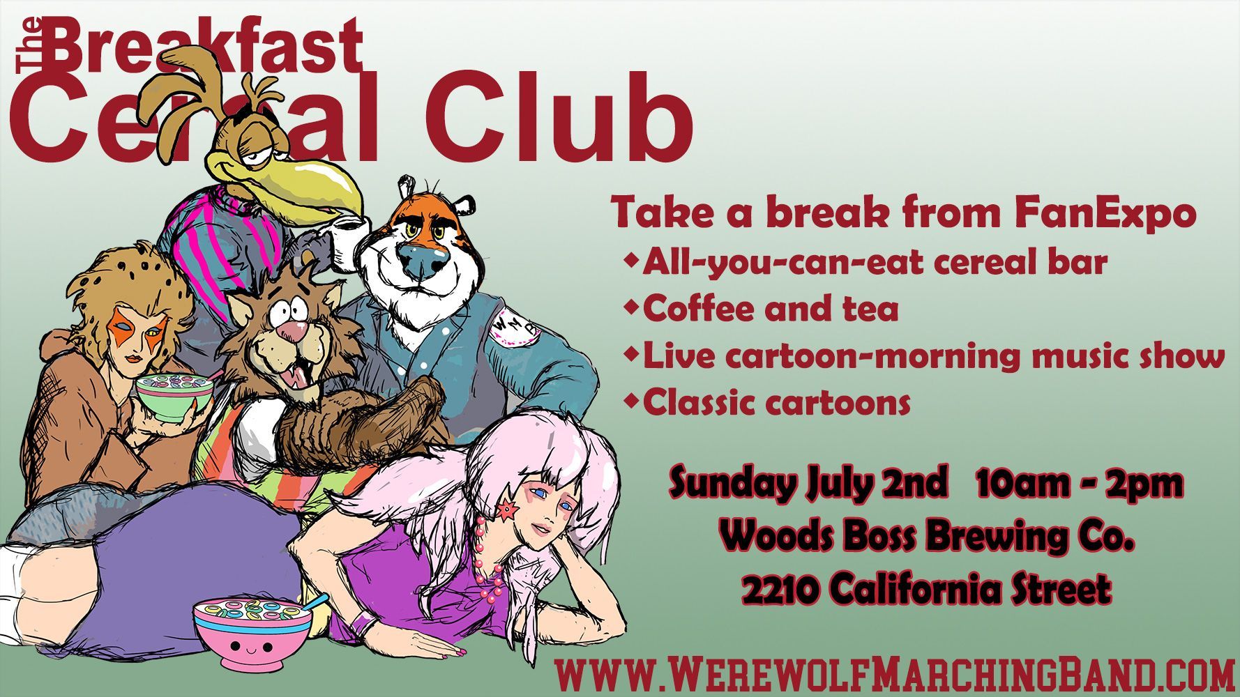 Grab a spoon and bowl, and enjoy all-you-can-eat cereals! Have some coffee or tea as you watch classic cartoons and commercials from decades gone by. And get ready to sing along, dance or just gape in wonderment as a live band performs your favorite weekend morning theme songs, commercial jingles and memories!